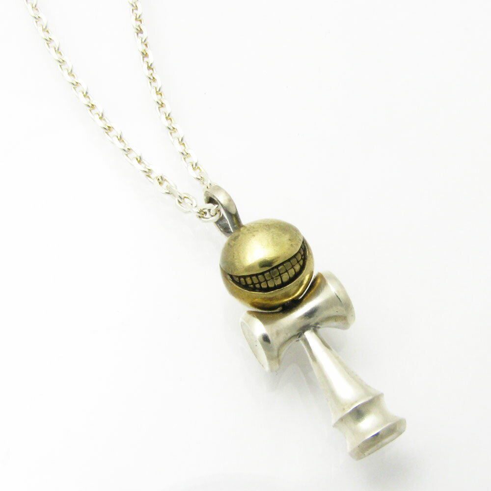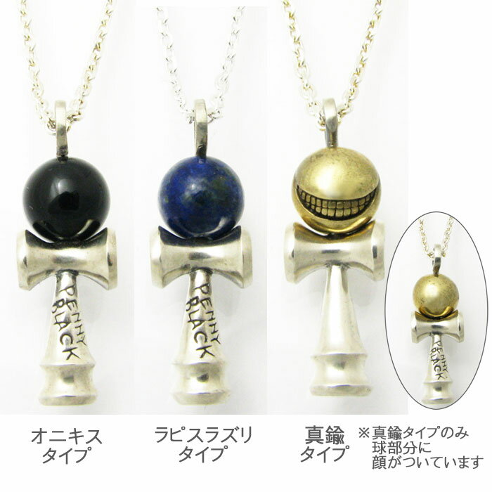 【送料無料】世界的にブームのけん玉がアクセサリーになりました シルバーをベースに球の部分には3種類のバリエーションを用意しました 天然石のタイプはブラックオニキスとラピスラズリの2種類 真鍮タイプの球にはにやりと笑う表情付きです どのタイプを選んでも楽しいこと間違いなしの シルバーペンダントです 素材:シルバー925(ブラスタイプのみ真鍮を使用) 重さ:天然石タイプ約7.3g/ブラスタイプ約8.9g 大きさ:約28.6mm×9.4mm 厚み:約8.7mm チェーン:45cm ■ SILVER 925・シルバー925・純銀 ■ シルバー925とは、通常「シルバーアクセサリー」と 呼ばれるものの素材です。