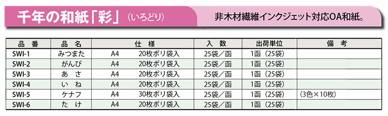商品名 プリンター用和紙「彩」ケナフA4・30枚×25袋 仕 様 ・サイズ:A4(297mm×210mm)・30枚×25袋 説 明 ・和紙の風合いがある紙で、インクジェット対応です。