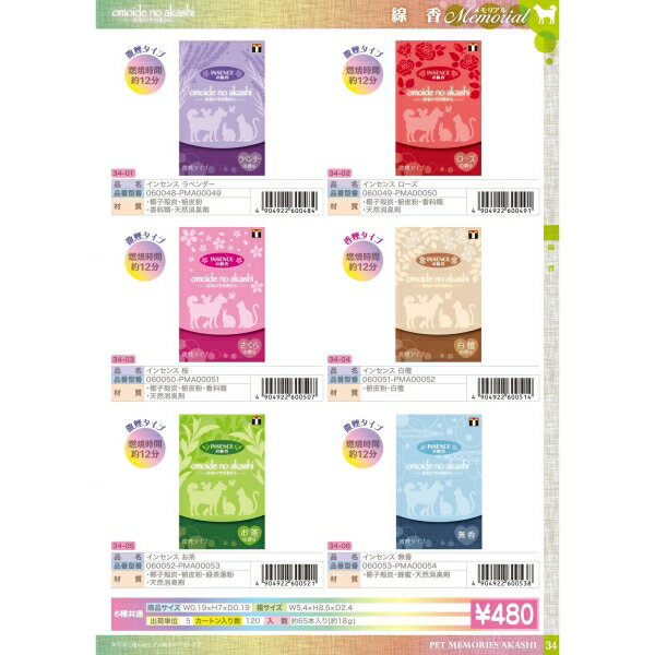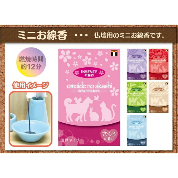 インセンス 白檀 [線香・ミニ寸・ペット]インセンス 桜 [線香・ミニ寸・ペット]インセンス ローズ [線香・ミニ寸・ペット]インセンス ラベンダー [線香・ミニ寸・ペット]インセンス 無香 [線香・ミニ寸・ペット]【インセンス お茶 [線香・ミニ寸・ペット]】広告文責(有)イースクエアTEL:0120-532-772オモイデノアカシW0.19×H7×D0.19■生産地:日本■素材・成分:燃焼時間約12分 椰子殻炭・椨皮粉・緑茶葉粉・天然消臭剤 約65本入り(約18g)■パッケージ:個別箱天国へ旅立った愛おしいペットちゃんのためのお茶の香りがするお線香です。